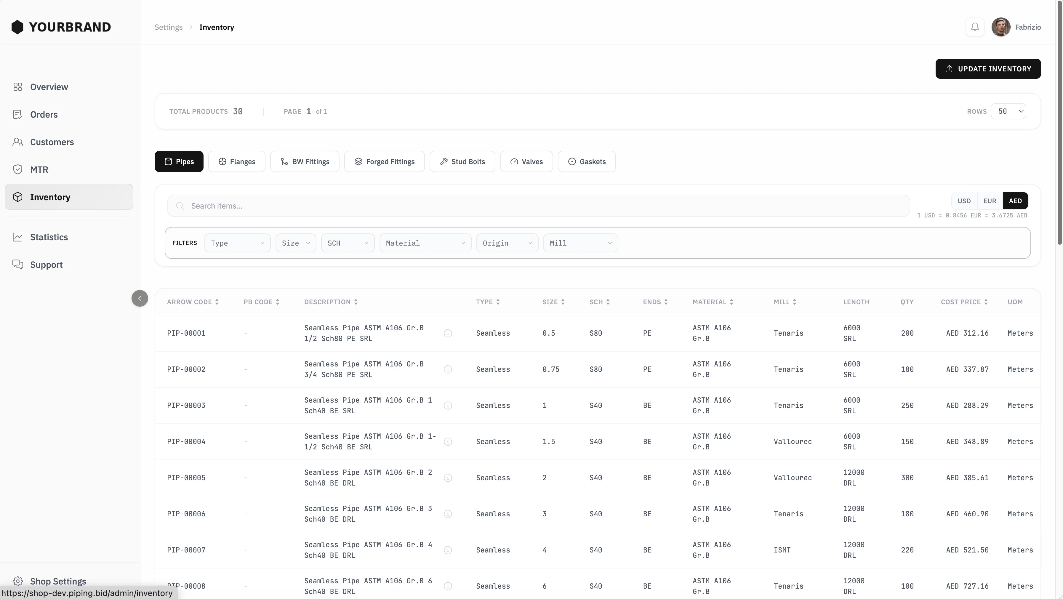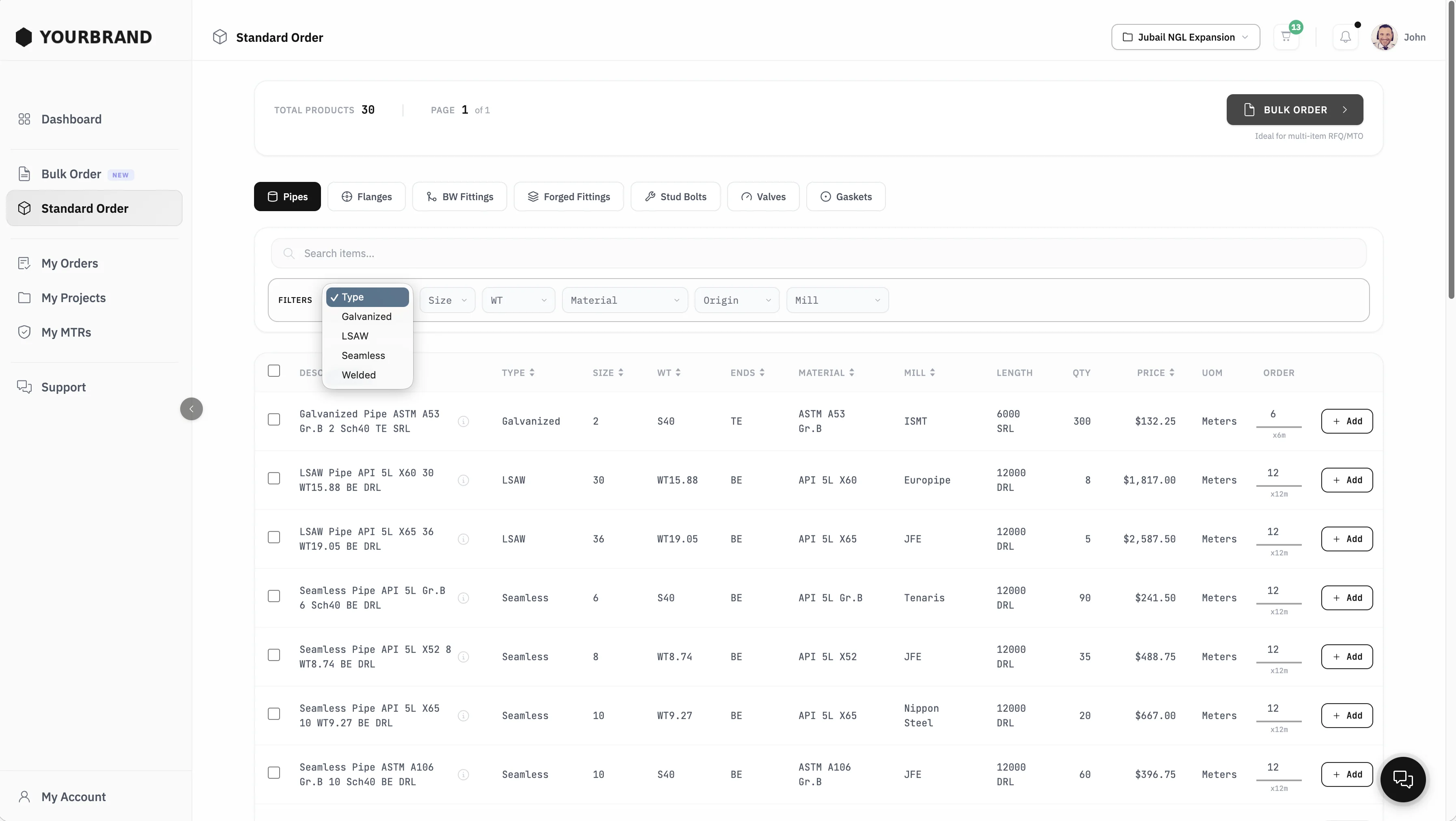 Your entire inventory on one page. Filter by type, size, material, origin, mill. Add to cart in one click.
