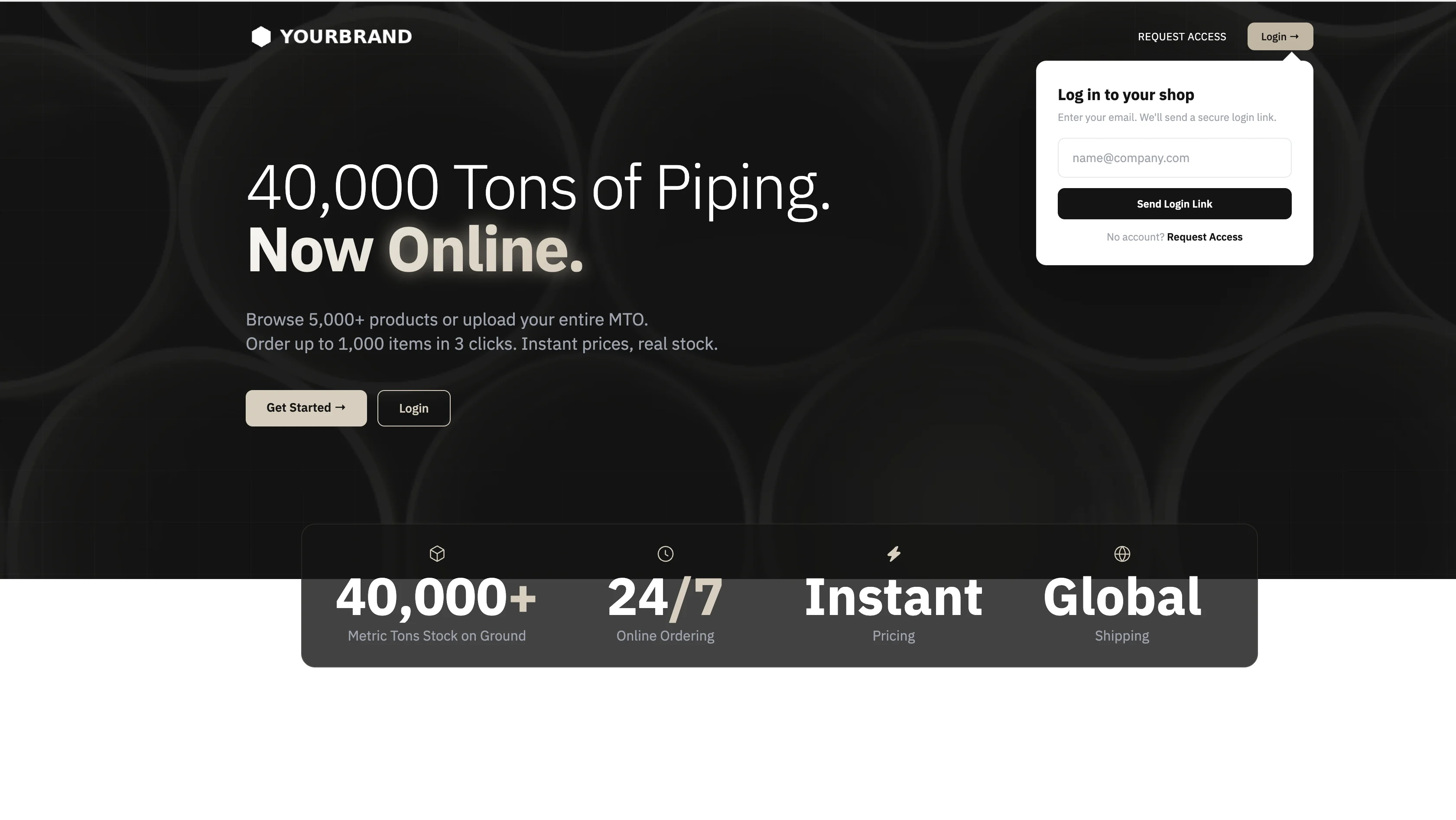 Not a generic shop builder. Every feature is designed for how piping suppliers actually work.
