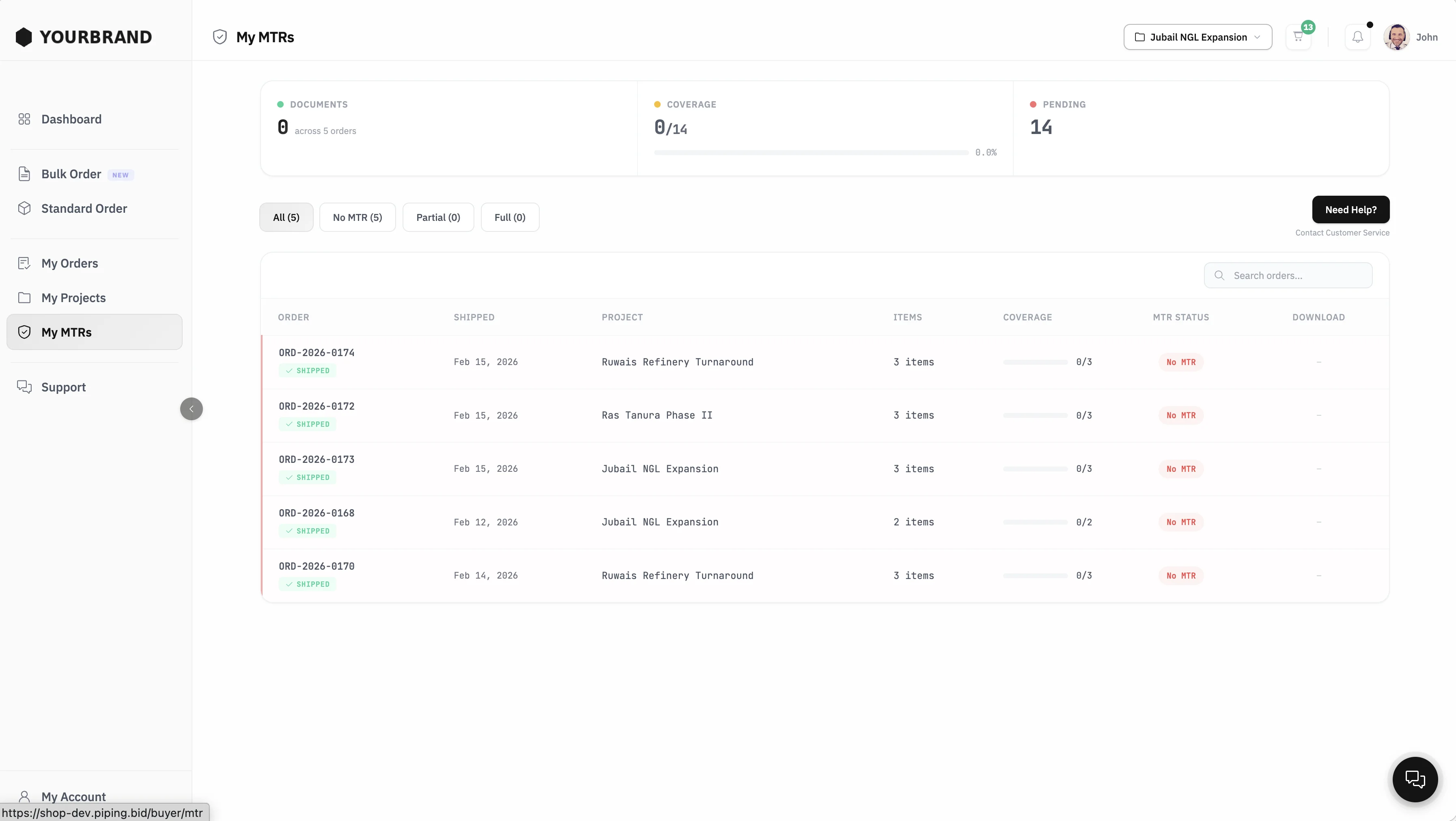 All MTRs organized by order and project. Buyers check coverage, download documents, track pending items. No more email or WeTransfer.